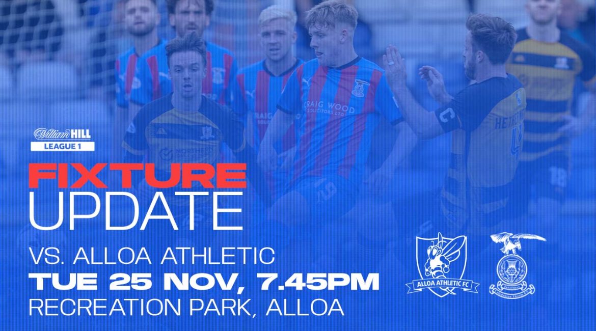 Our William Hill League 1 away match against Alloa Athletic, which was originally scheduled for Saturday 15 November, has been rescheduled to Tuesday 25th November, 7.45pm kick-off due to international call-ups following a request to the SPFL from Alloa Athletic FC.